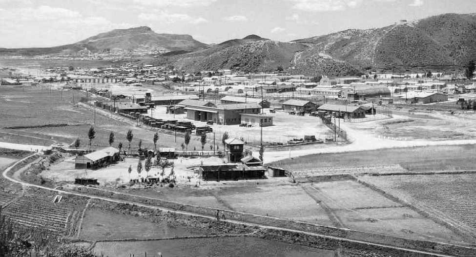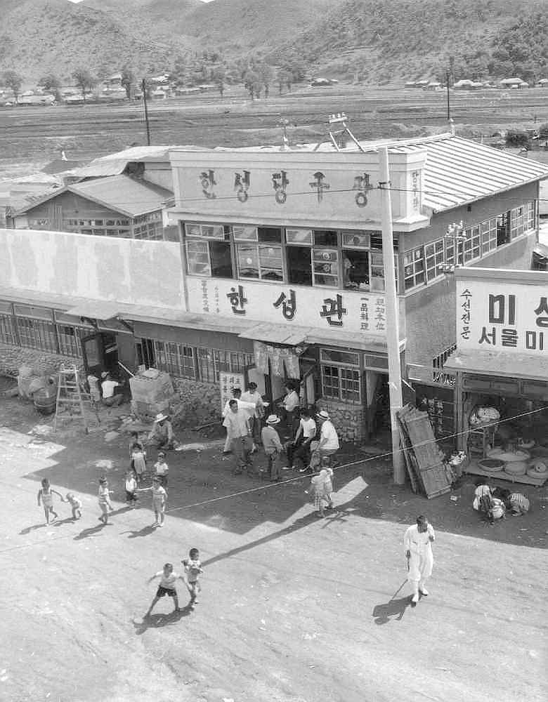 The photo above is another shot of beautiful downtown Yongjukol, taken in the spring of 1962. It shows the Han Song Pool Hall and restaurant, with the building undergoing expansion. There are numerous things in this picture that are very typical of Yongjukol at that time. Note the kids in the street wearing shirts but no pants. This was common for kids up to about five or six. Also note the old Korean "papasan" in the street dressed head to toe in white and all the unemployed men hanging around the pool hall.