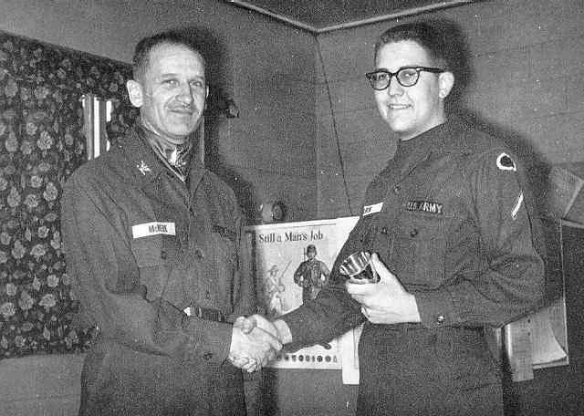 The photo above was taken around December 1960. It shows PFC Gary Clark (your webmaster) being presented with a brass cup by 508th Group CO Col McNear. The cup was in honor of winning "508th Group Soldier of the Month" for December 1960.