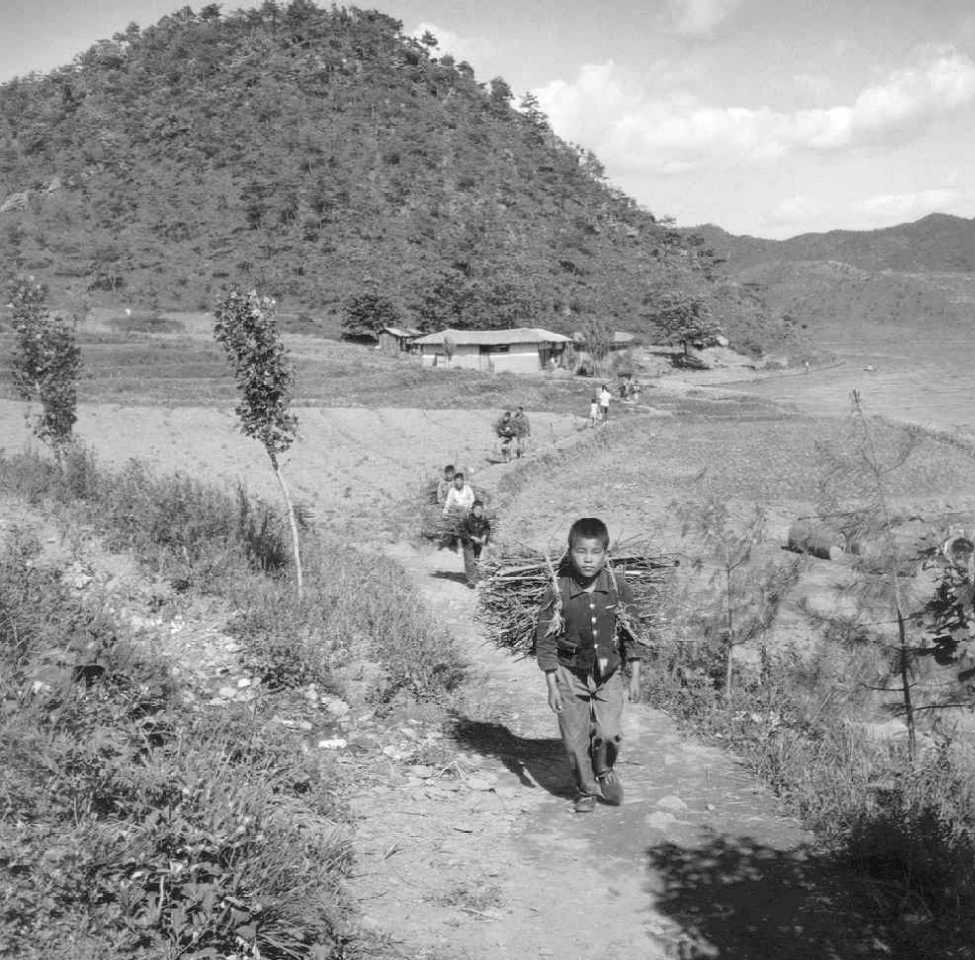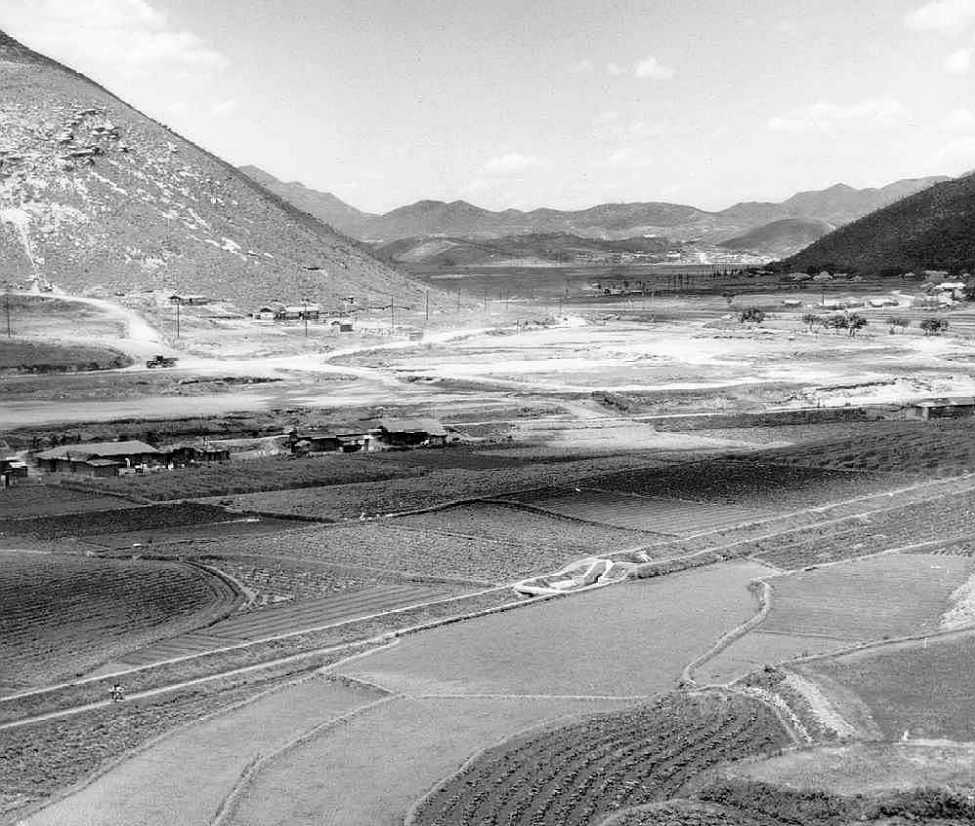The photo above shows the north edge of the reservoir, where there was a well-traveled foot path. Note the kid with the load of wood on his back, a common sight in Korea in those days. If you follow this foot path far enough you find it eventually leads to the town of Pubwon-ni (also known by the GIs as "Mickey Mouse Corners"). It takes about an hour to walk there using this path. I know, I did it.